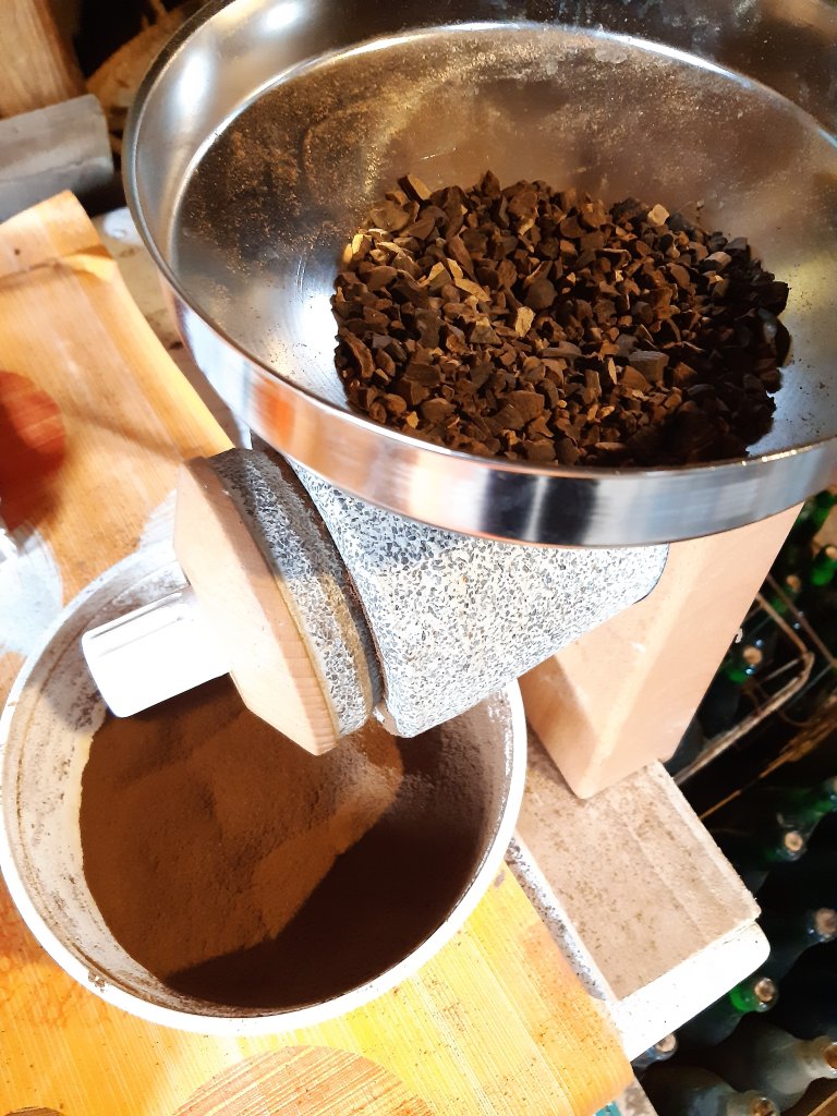 Now there are two options. You can either mix the acorns and use the mass as a flour substitute – either you use it immediately or freeze for later. Or you can dry and roast them in the oven at 180°C . Depending on the degree of roasting, you can then use it to make flour or coffee. I prefer a light roasting for flour and a strong one for coffee. After roasting you have to grind them. We needed to crash the dried acorn in a kitchen towel with a hammer, otherwise it would have clogged our mill. Since it wasn´t an electric grinder, it was a great workout for my arms!